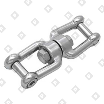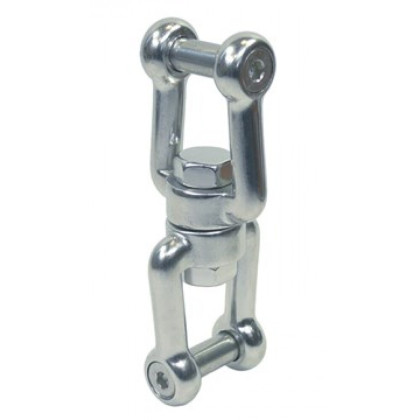 Вертлюг вилка-вилка с внутренним шестигранником используется для обеспечения нескручиваемости цепи или каната, для снятия лишних нагрузок и свободного вращения элементов, также может применяться для создания кратковременного крепления. Состоит из трех основных деталей — две размыкаемых по краям скобы и стержень между ними, который также принято называть упорным подшипником. Подшипник позволяет скобам свободно вращаться вокруг своей оси.